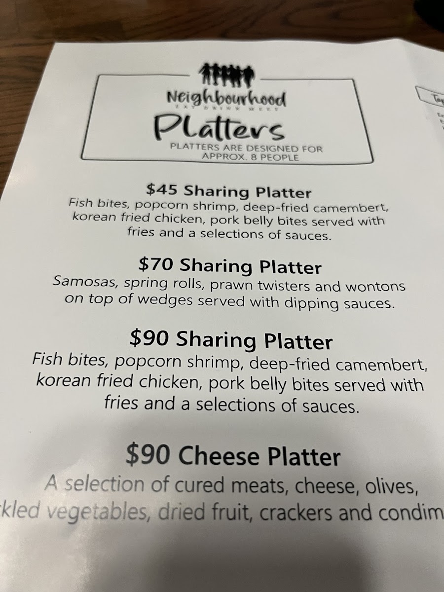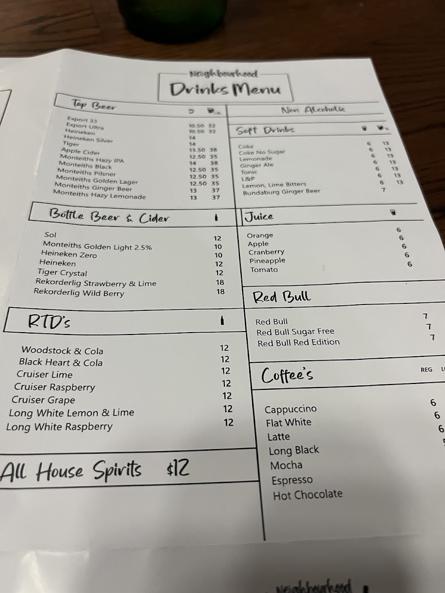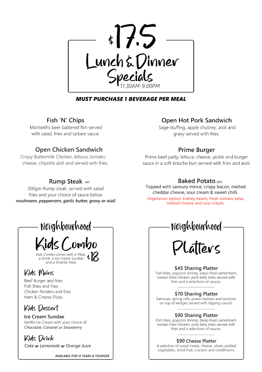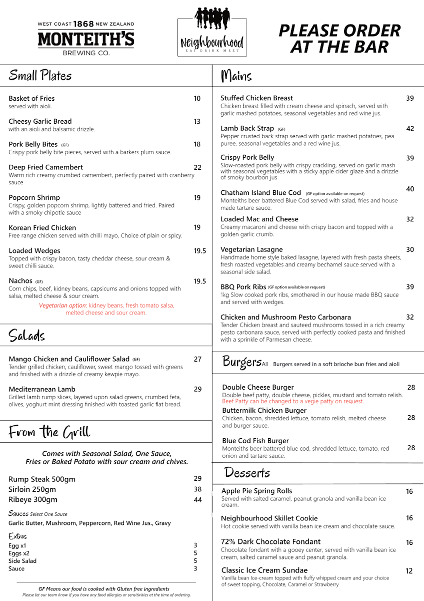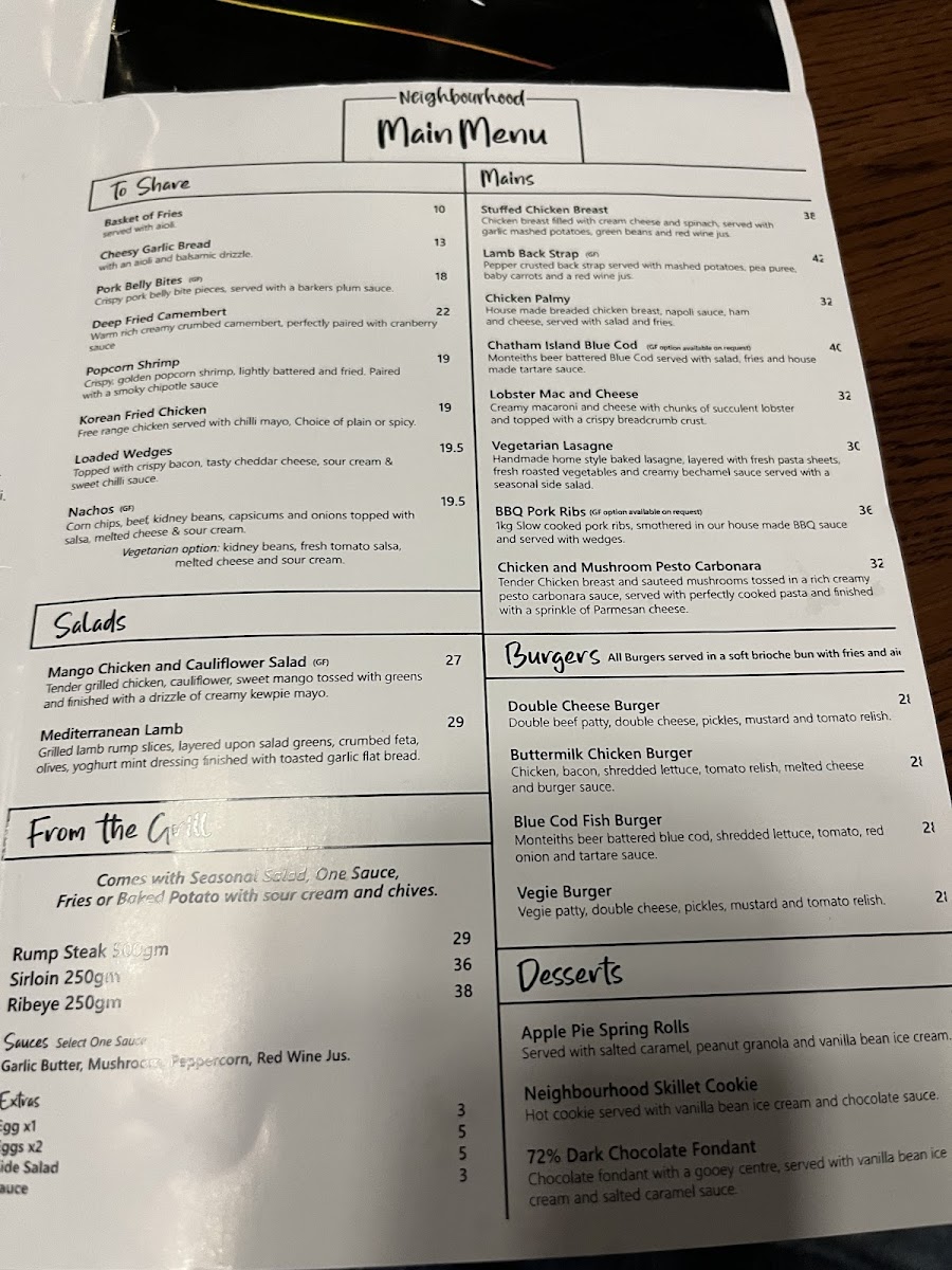 From a reviewer’s perspective, the menu at Neighbourhood - Bar & Restaurant in Palmerston North offers a well-balanced and thoughtfully curated selection that caters to a wide range of tastes, making it an excellent conclusion to the dining experience. The Small Plates set the tone perfectly, with comforting and shareable options such as Basket of Fries, Cheesy Garlic Bread, Pork Belly Bites (GF), Deep Fried Camembert, and Popcorn Shrimp, all ideal for starting the meal or enjoying alongside a drink. The salad offerings add freshness and variety, particularly the Mango Chicken and Cauliflower Salad (GF) and Mediterranean Lamb, which combine bold flavors with satisfying textures. Moving into the mains, the menu truly shines with hearty and refined dishes like the Stuffed Chicken Breast, Lamb Back Strap (GF), Crispy Pork Belly, Chatham Island Blue Cod, and the indulgent Loaded Mac and Cheese, each showcasing comfort food elevated with quality ingredients. Burger lovers are equally well looked after, with classics and crowd-pleasers such as the Double Cheese Burger, Buttermilk Chicken Burger, and Blue Cod Fish Burger, all reflecting the restaurant’s relaxed yet polished style. For those seeking a premium grilled experience, the “From The Grill” section delivers generous cuts including Rump Steak 500gm, Sirloin 250gm, and Ribeye 300gm, appealing to diners who appreciate bold, meaty flavors. Finally, the dessert menu provides a satisfying finish, with highlights like Apple Pie Spring Rolls, the indulgent Neighbourhood Skillet Cookie, the rich 72% Dark Chocolate Fondant, and the nostalgic Classic Ice Cream Sundae. Overall, the menu successfully combines comfort, variety, and quality, reinforcing Neighbourhood’s identity as a welcoming spot for both casual dining and memorable meals.